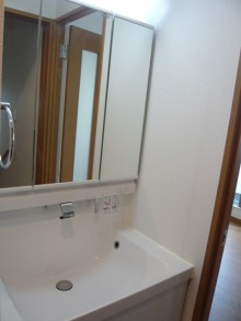 洗面台はも便利な三面鏡タイプです。鏡の中はもちろん収納になっているので、化粧品やちらかりやすい歯ブラシやワックスなどを整理整頓♪
