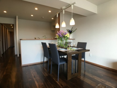 高級感のあるダークブラウンのフローリングで落ち着いた空間を演出。