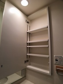 洗面室の洗濯機置場の上には高さが自由に変えれる棚収納もついてます。