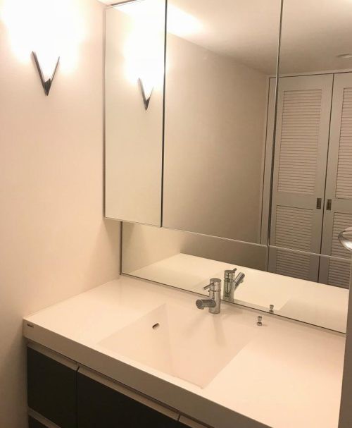 洗面台は三面鏡タイプです。洗面台の下もしっかり収納できます♪