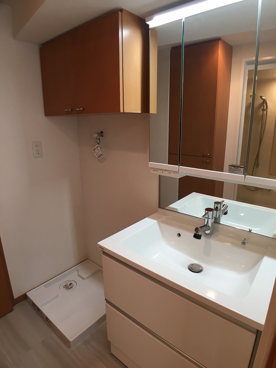 洗面台は三面鏡タイプ♪ 洗濯防水パンの上や背後にはしっかりと収納スペースがあります。