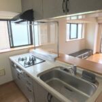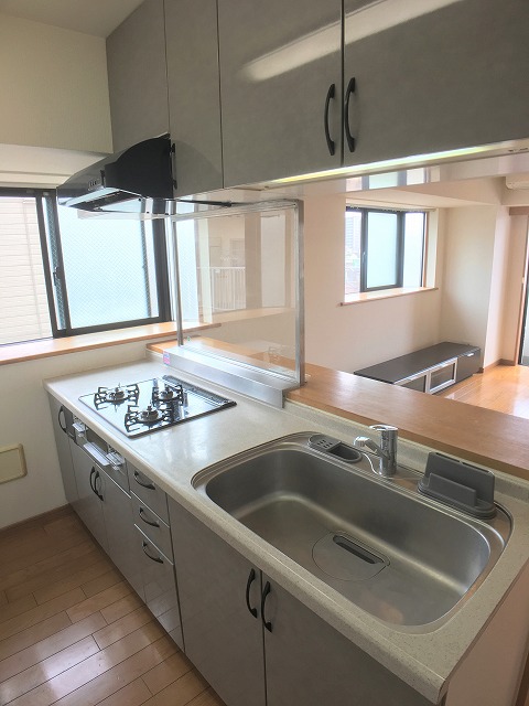 出窓があって明るいキッチンは、3口ガスシステムキッチン(グリル付)です。